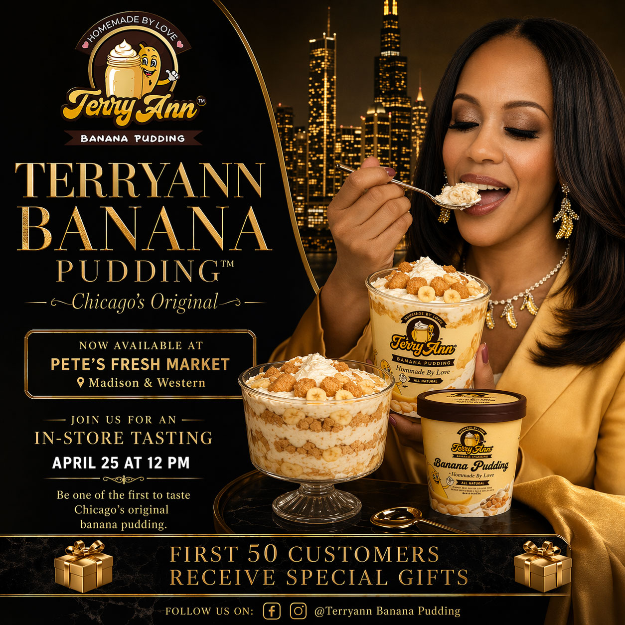 The official launch at Pete’s Fresh Market (Madison & Western location) will include an exclusive in-store tasting beginning at 12:00 PM, offering customers the opportunity to sample the product, meet the founder, and experience firsthand what sets Terryann Banana Pudding™ apart as “Chicago’s Original.”